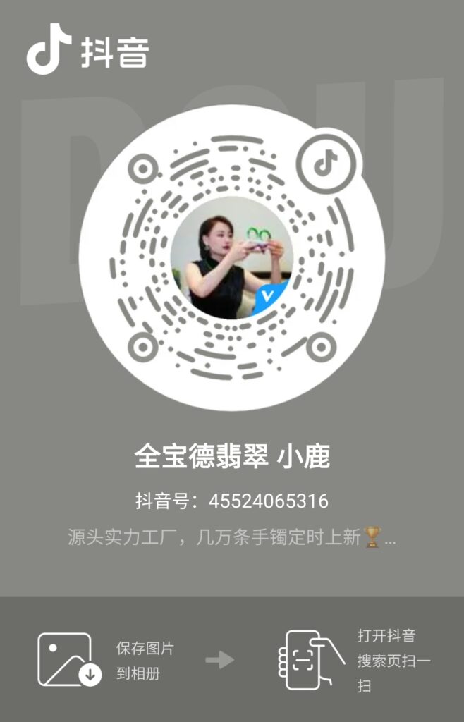 您好,海外的华人朋友。很感谢认识您! 这是我的微信二维码,请您扫码添加,请您务必备注来源海外。 我的日常直播都是在中国大陆的抖音平台上,请您用抖音扫码关注我,或者搜索“全宝德翡翠小鹿”